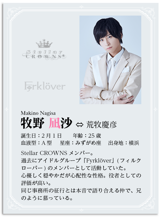Stellar CROWNSに加入した矢先、兄の楽曲の盗作疑惑が浮上し真実を求め失踪。解決後、ユニットを支える立場として楽曲などに参加していたが、突如、クイーンレコードの社長に就任することを発表する。